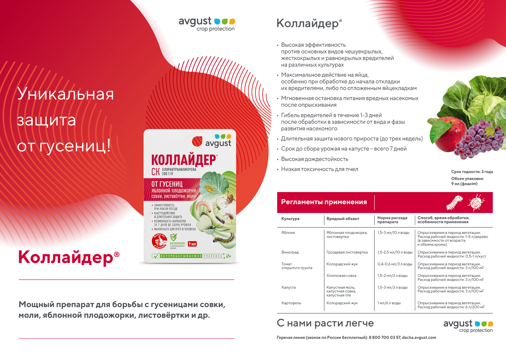 - Высокая эффективность против основных видов чешуекрылых, жесткокрылых и равнокрылых вредителей на различных культурах.