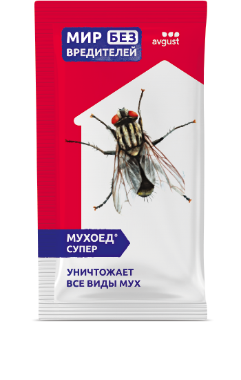 Чтобы обезопасить себя и свою семью, а также избавиться от назойливого жужжания мух, компания «Август» предлагает эффективное средство «Мухоед Супер» из серии бытовой химии «Мир без вредителей». Препарат выпускается в гранулах, его можно наносить сухим или влажным способом.